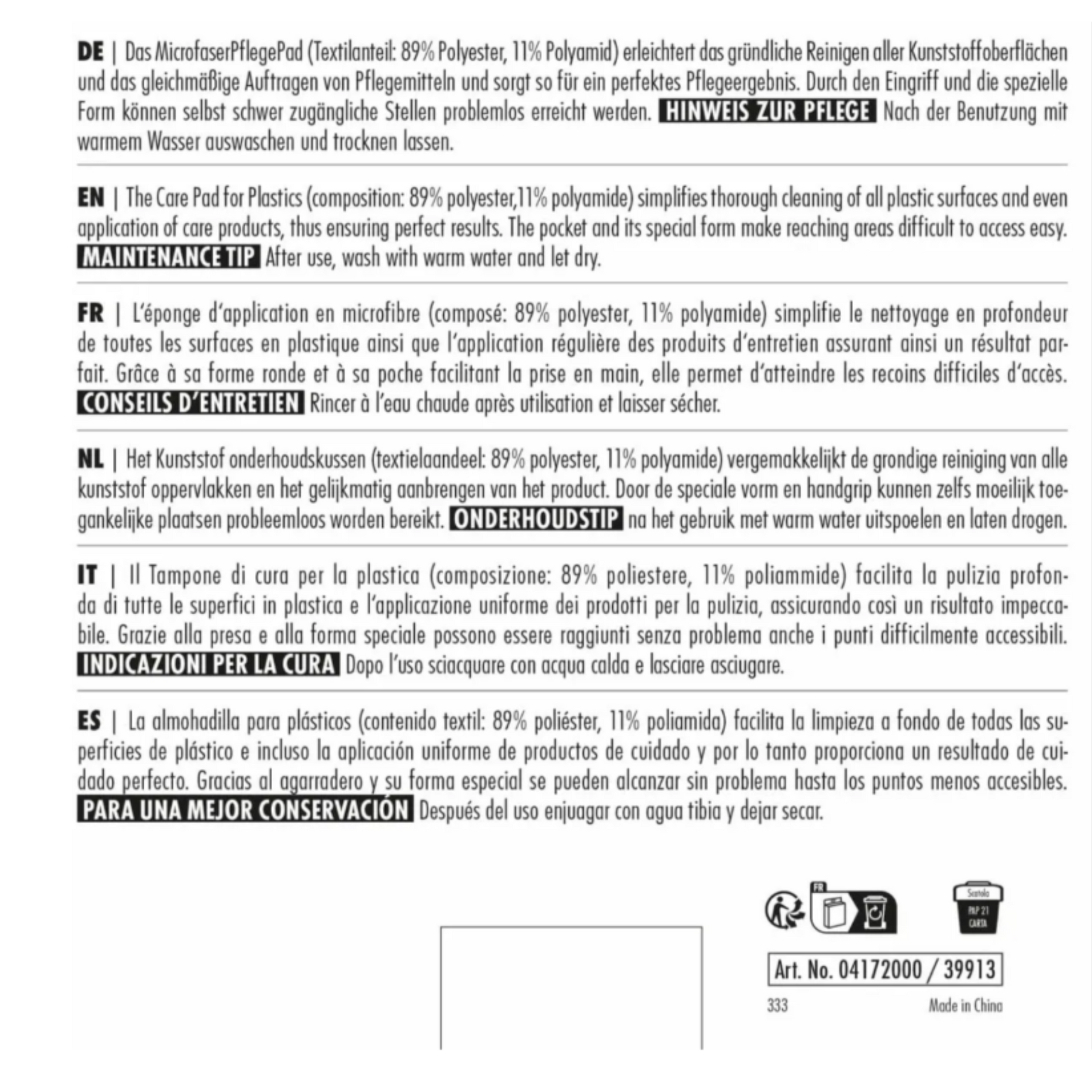 Erleichtert das gleichmäßige Auftragen von Kunststoffpflegemitteln im Innenraum (z.B. Cockpit) und sorgt so für ein gründliches Pflegeergebnis. Durch den Eingriff und die spezielle Form können selbst schwer zugängliche Stellen problemlos erreicht werden.